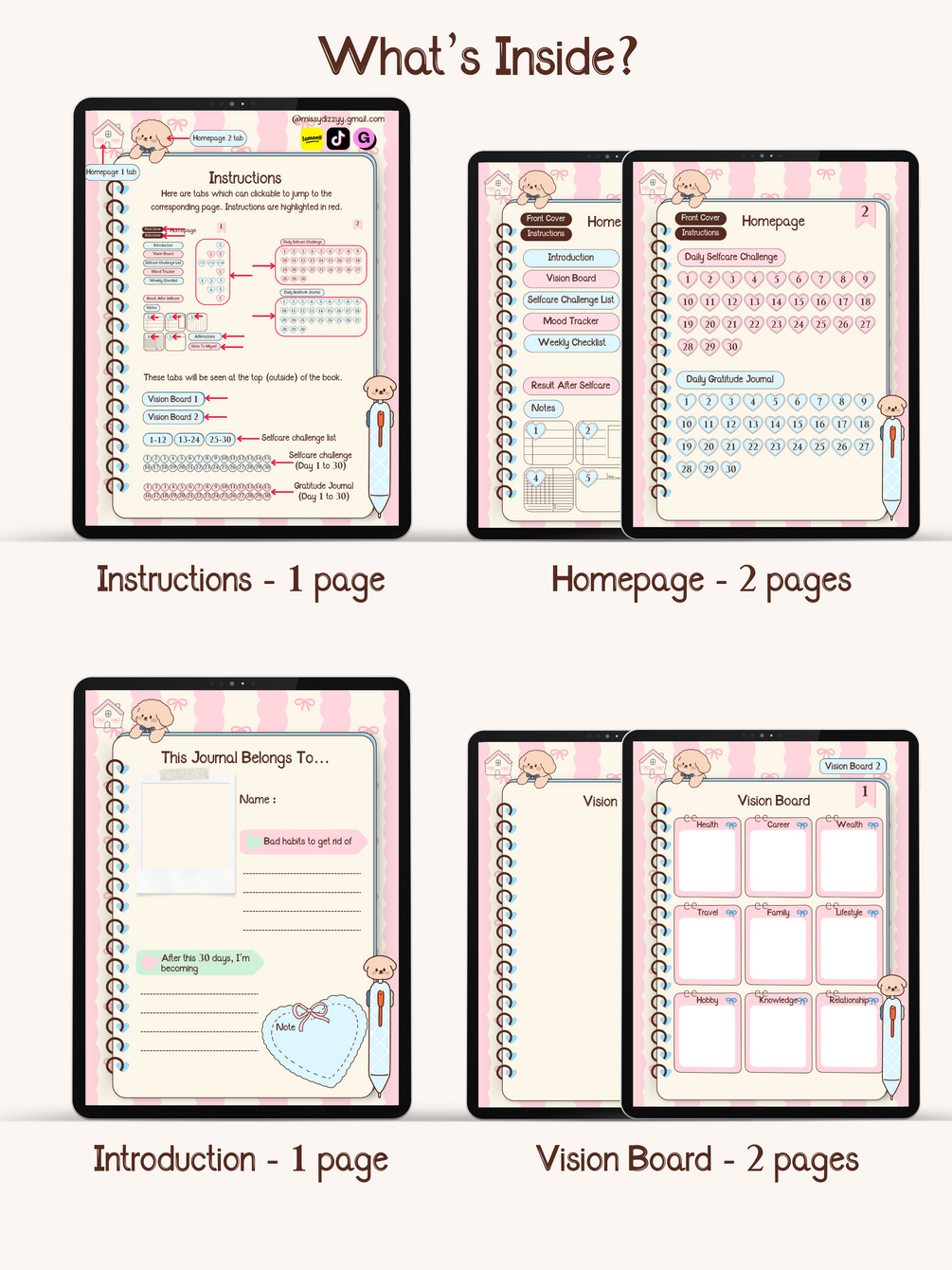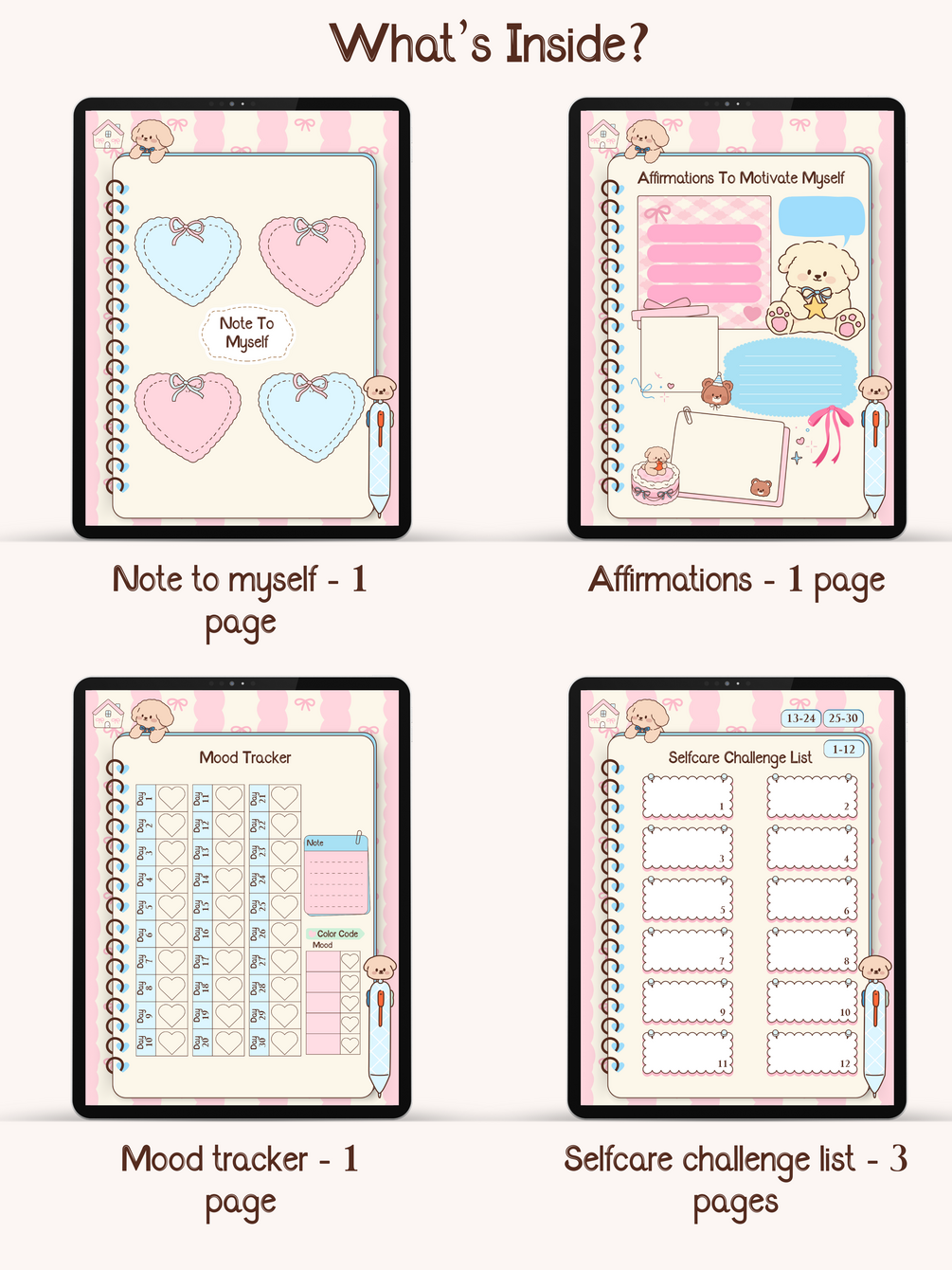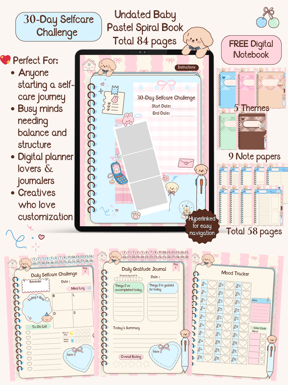 Transform your daily routine into a mindful journey with this beautifully designed 84-page Self-Care Challenge Digital Planner. Thoughtfully crafted to guide you through 30 days of intentional self-love, reflection, and growth โ€” at your own pace.